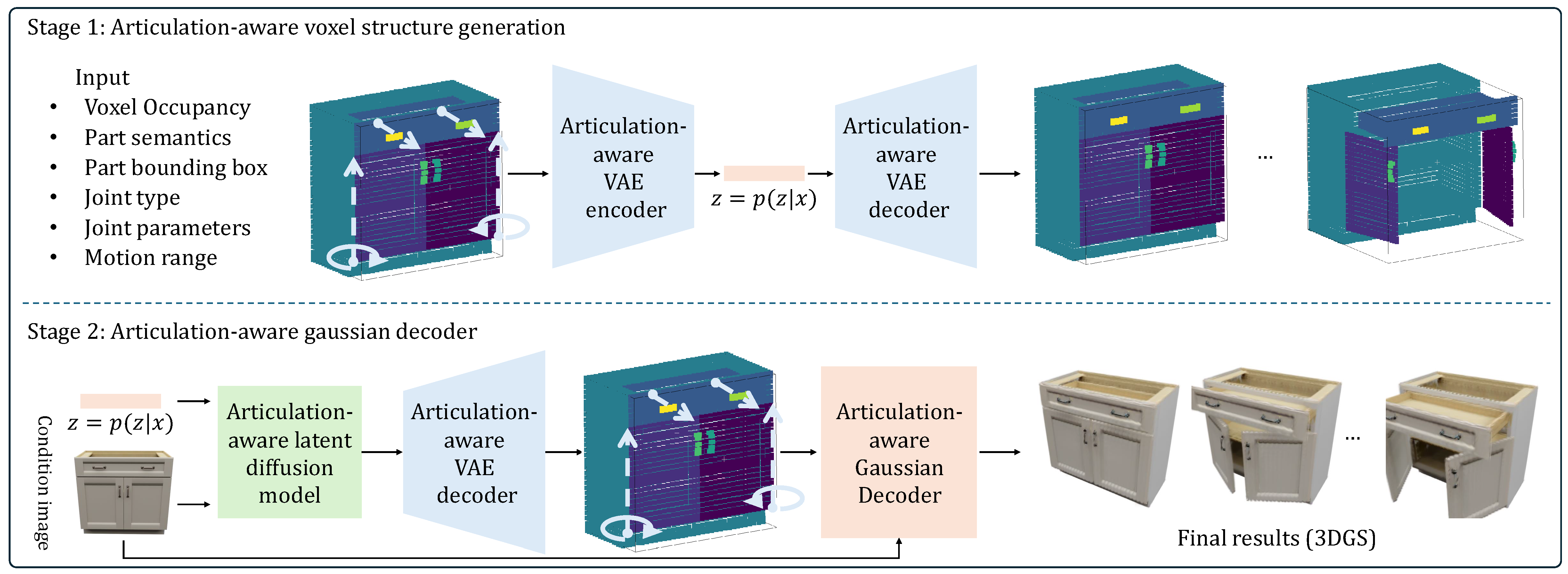 The overall architecture of ArtiLatent. Given voxel-level articulation-aware inputs (occupancy, semantics, joint types, bounding boxes, joint parameters, and motion ranges), we encode them into a latent representation using an articulation-aware VAE. A conditional diffusion model samples articulation-aware latent codes under user-specified conditions (e.g., image), which are then decoded into an animatable voxel structure. The final appearance is generated using an articulation-aware Gaussian decoder, producing high-fidelity 3D Gaussian splats with consistent geometry and appearance across motion states.